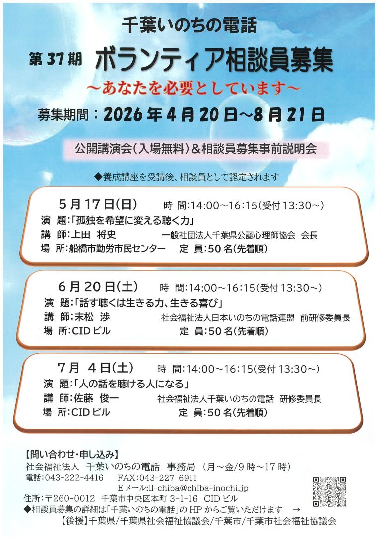問合せ・申し込み:千葉いのちの電話事務局 043-222-4416(平日9:00から17:00)