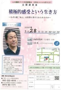 ドリアン助川氏 公開講演会 積極的感受という生き方●申込先着順・入場無料諸般の事情により中止とさせていただきました。 ① 2020年3月28日(土) 13:30~15:30(受付13:00~) 主催:社会福祉法人千葉いのちの電話 共催 山武市 お問い合せ/申込み 社会福祉法人 千葉いのちの電話事務局(月~金9:00~17:00 祝日休) |