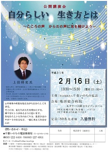 上田 将史氏 公開講演会 自分らしい生き方とは(終了しました)●申込先着順・入場無料 ① 2019年2月16日(土) 13:30~15:30(受付13:00~) お問い合せ/申込み 社会福祉法人 千葉いのちの電話事務局(月~金9:00~17:00 祝日休) |