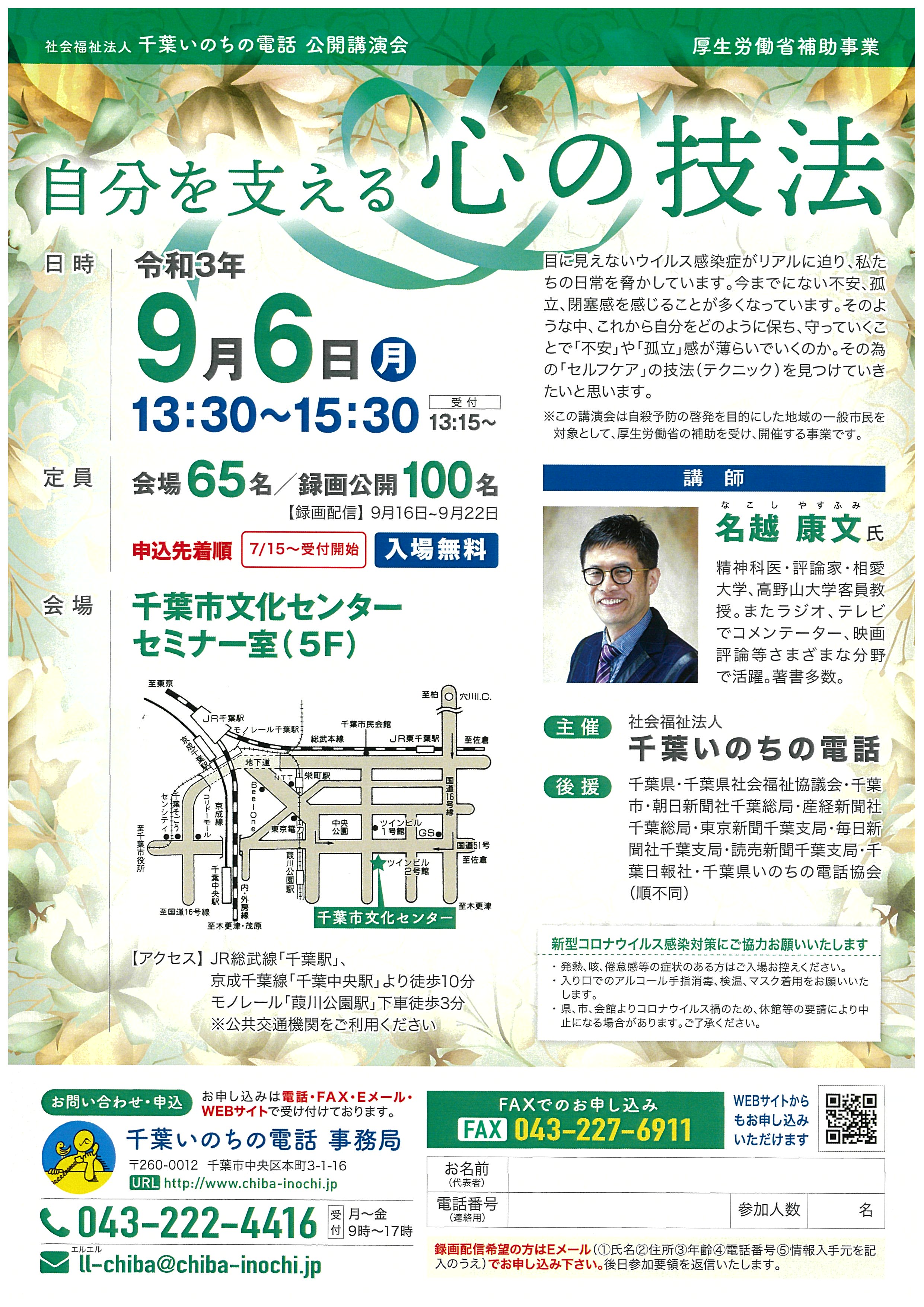 日時:2021年9月6日(月) 13:30~15:30(受付13:15~) 主催:社会福祉法人千葉いのちの電話 (厚生労働省補助事業) お問い合せ/申込み 社会福祉法人 千葉いのちの電話事務局(月~金9:00~17:00 祝日休) |