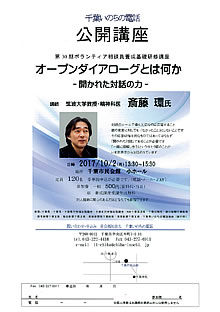 千葉いのちの電話 公開講座 オープンダイアローグとは何か ―開かれた対話の力― 講演会 2017.10.022025.09.24 千葉いのちの電話 公開講座 オープンダイアローグとは何か ―開かれた対話の力― 講 師:斎藤 環氏 筑波大学教授・精神科医 日 時:10月2日(月) 13:30~15:30 場 所:千葉市民会館 小ホール 参加費:一般500円(資料代・当日) お問い合せ/申込み 千葉いのちの電話事務局 (月~金 9:00~17:00) TEL 043-222-4416 FAX 043-227-6911