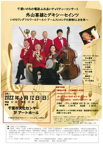 千葉いのちの電話ふれあいチャリティーコンサート <外山喜雄とデキシーセインツ>(終了しました)いのちワンダフルワールド ~ルイ・アームストロングの素晴らしき世界~ 出演者:外山喜雄(トランペット・ボーカル) 外山恵子(ピアノ・バンジョー) 広津誠(クラリネット) 粉川忠範(トロンボーン) 藤崎羊一(ベース)サバオ渡辺(ドラムス) 定員/料金:指定席 3,500円 お問い合せ/申込み 千葉県いのちの電話協会事務局 (月~金 9:00~17:00) |